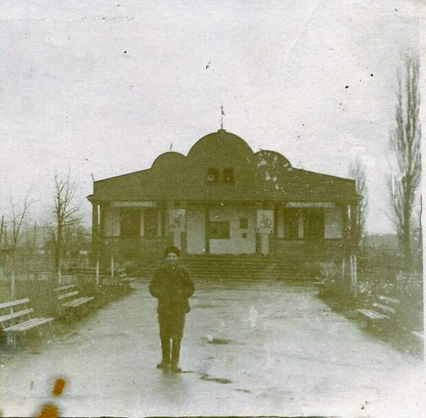 Бывший станичный Храм ст.Абадзехской , без купола, был перестроен под дом культуры и кинозал. Мужчина на фоне здания Трунов Виктор, кино механик хутора Шевченко, фото сделано в 1967 году в 1968г. случился пожар и здание полностью сгорело.