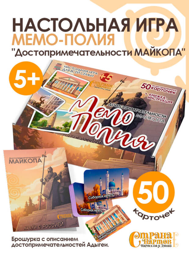 В Адыгее вышла настольная игра проекта "Страна Нартов" о достопримечательностях региона. Возраст: от 5 до 12 лет. Количество игроков: от 2 до 6. Мемо-Полия "Достопримечательности Майкопа" - игра действительно интересная и удивительно полезная! Она с лёгкостью поднимет настроение большой и маленькой компании.