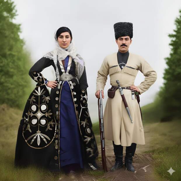 Кабардинский князь Темиркан Ахлов из селения Ахлово (ныне Нижний Курп) со своей сестрой Таужан. Нальчик. Терская область, 1900 г.